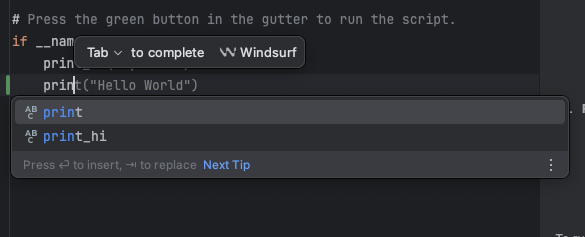 prin 까지만 입력하고 기다리면 뒤에 Hello World를 AI가 제안합니다.