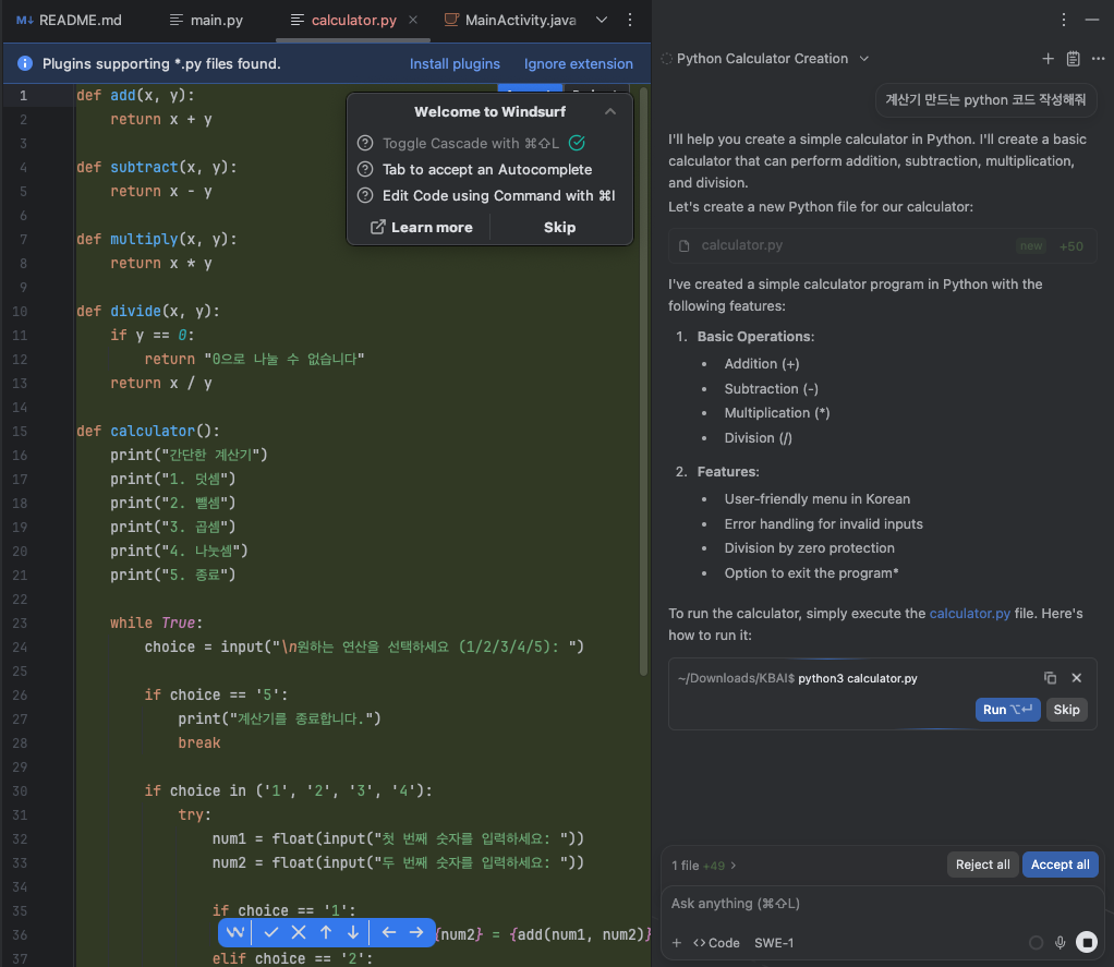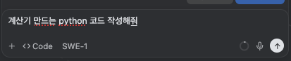 요청사항을 빠르게 calculator.py 라는 파일을 생성해서 AI 가 자동으로 코드를 작성합니다.
