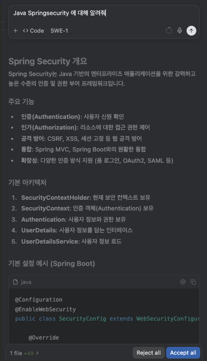 - 코드 설명, 테스트 코드 생성, 리팩토링 제안 등 다양한 개발 보조 기능