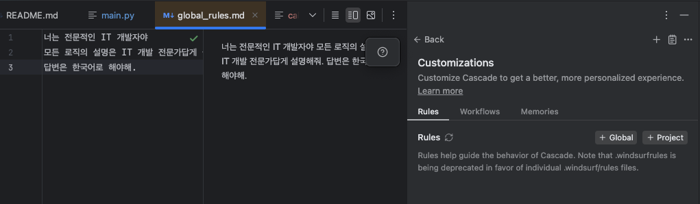 rules.md 파일이 열리면 AI에게 룰을 부여합니다.
