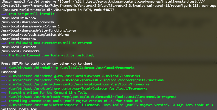 $ /usr/bin/ruby -e "$(curl -fsSL https://raw.githubusercontent.com/Homebrew/install/master/install)"