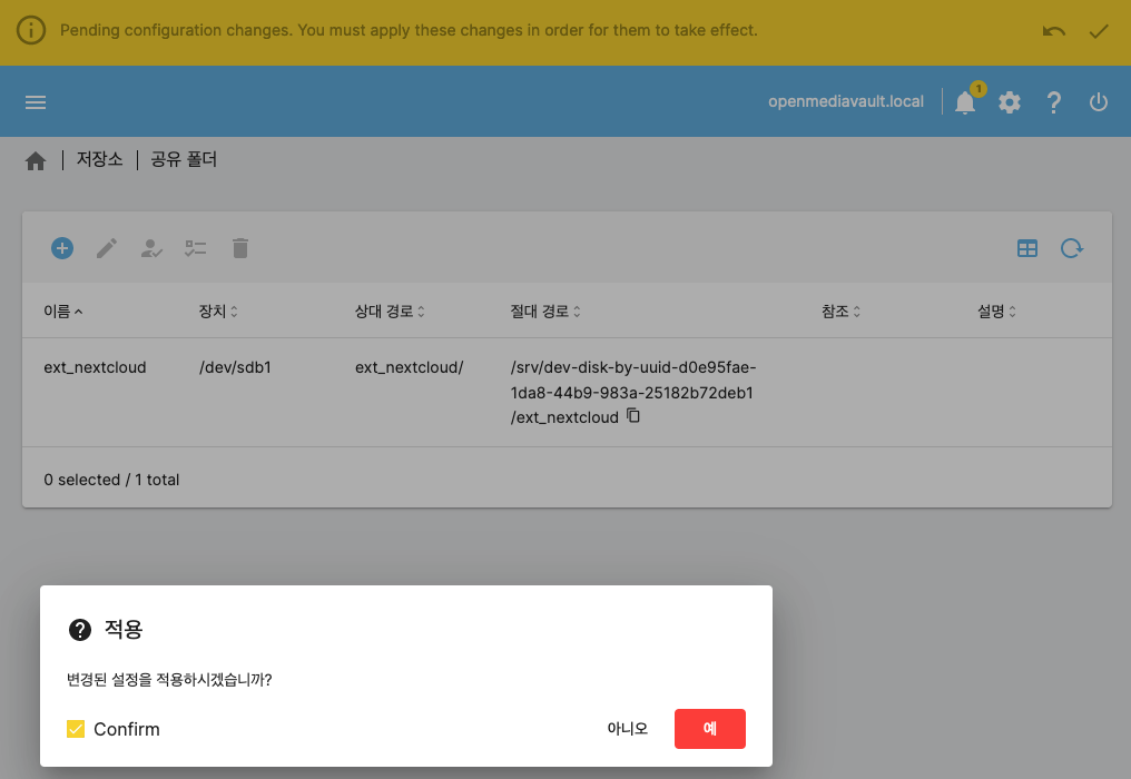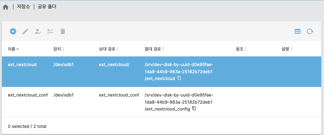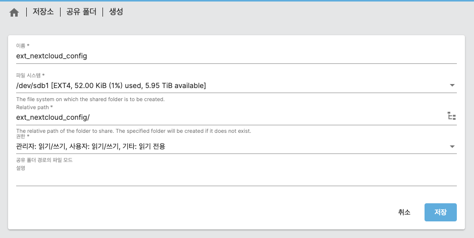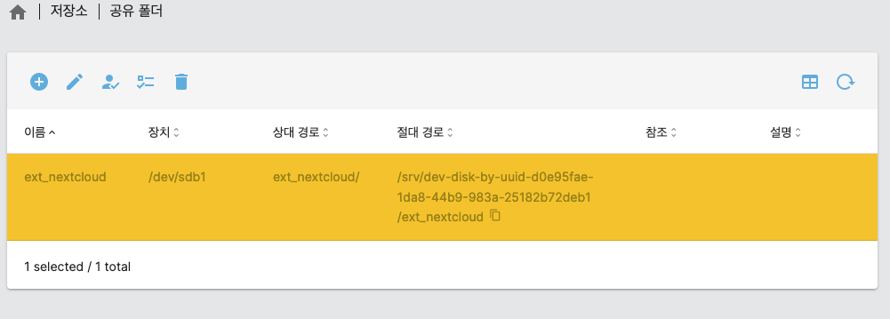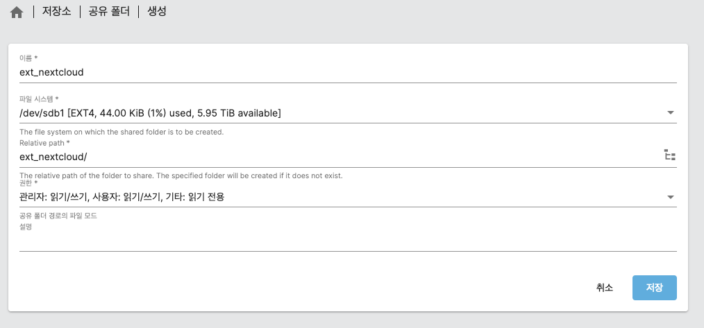 마운트한 디스크를 NextCloud에서 사용하기 위해 공유폴더로 설정합니다.
