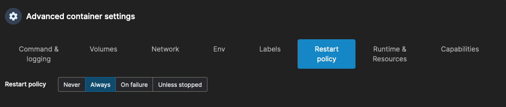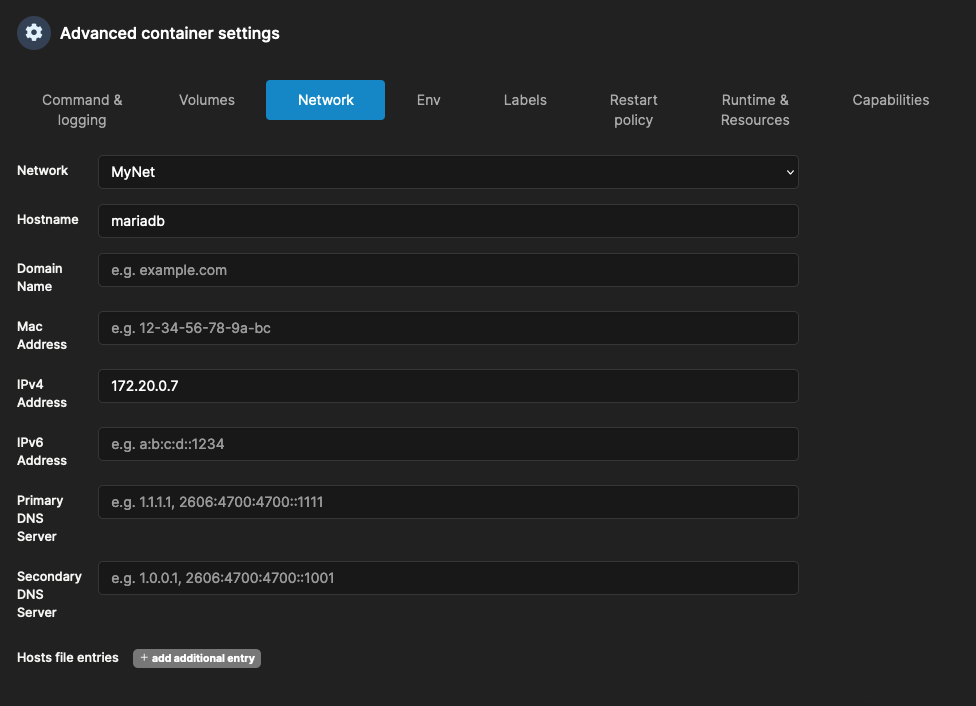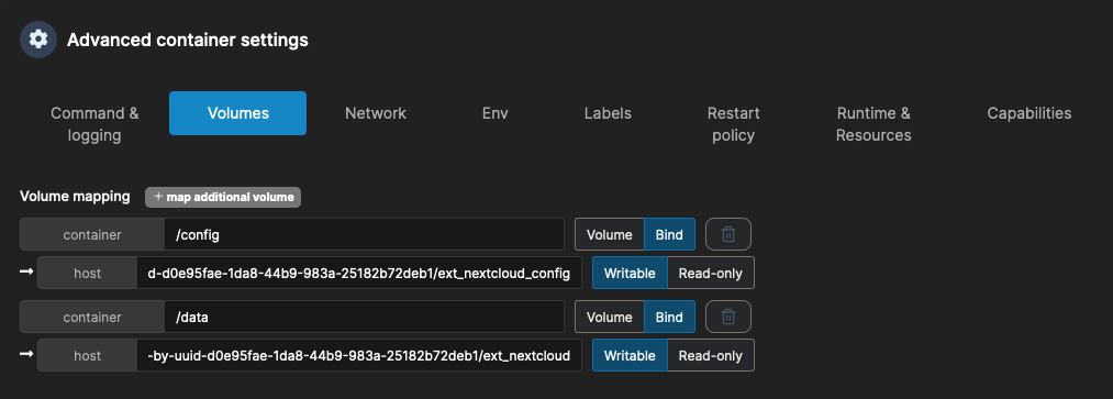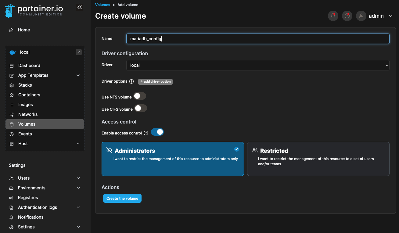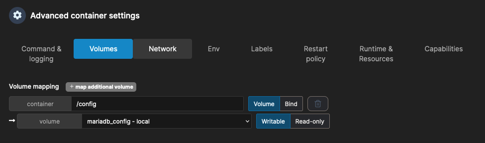 Volumes 셋팅으로 가서 앞서 생성한 mariadb_config 볼륨을 /config 로 맵핑합니다.