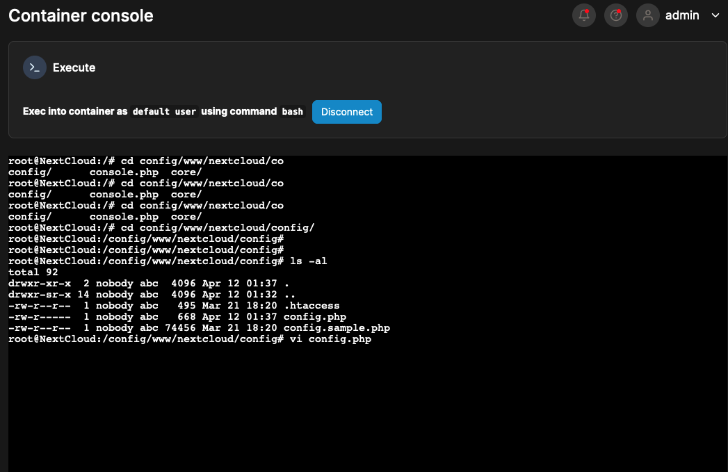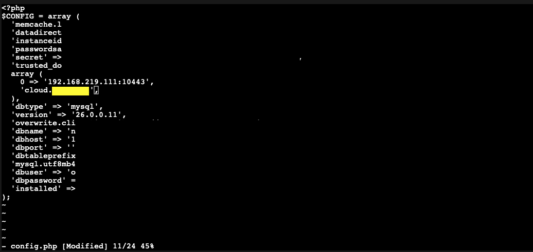 콘솔에 접속하여 config/www/nextcloud/config 경로의 config.php 파일을 열어 수정합니다.
