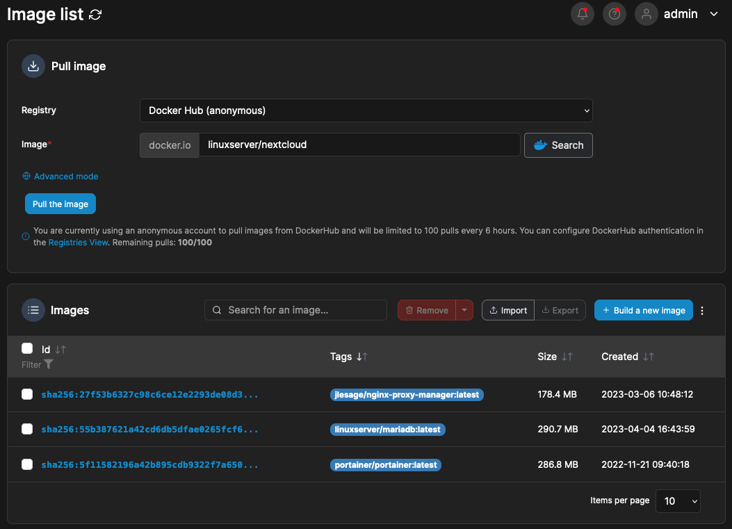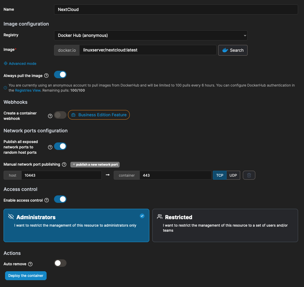 image 입력란에는 linuxserver/nextcloud:latest 를 입력합니다.