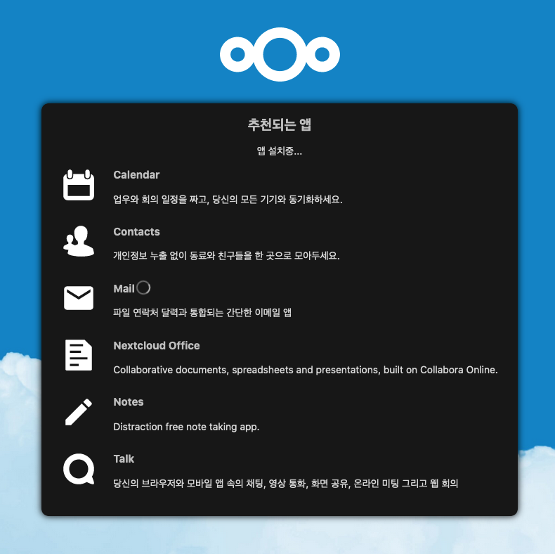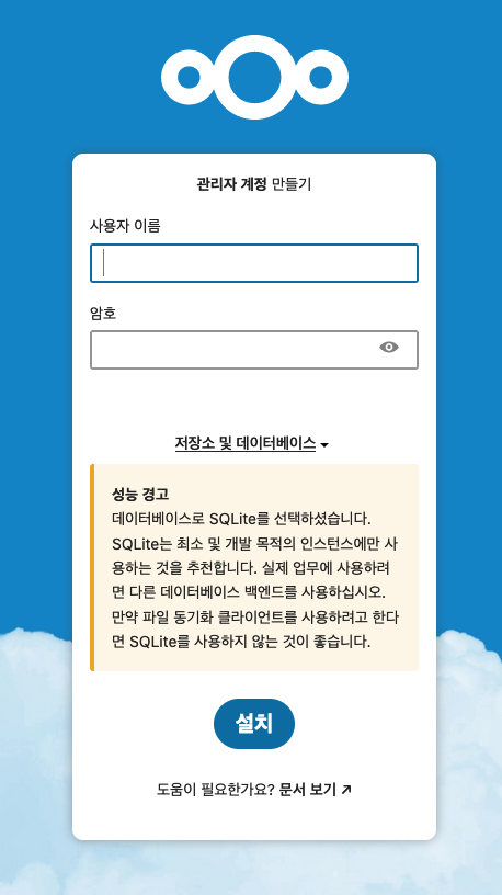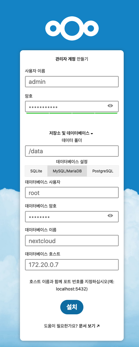 컨테이너가 시작되면 브라우저의 주소창에 nextcloud 로 nat가 되는 ip로 접속하거나