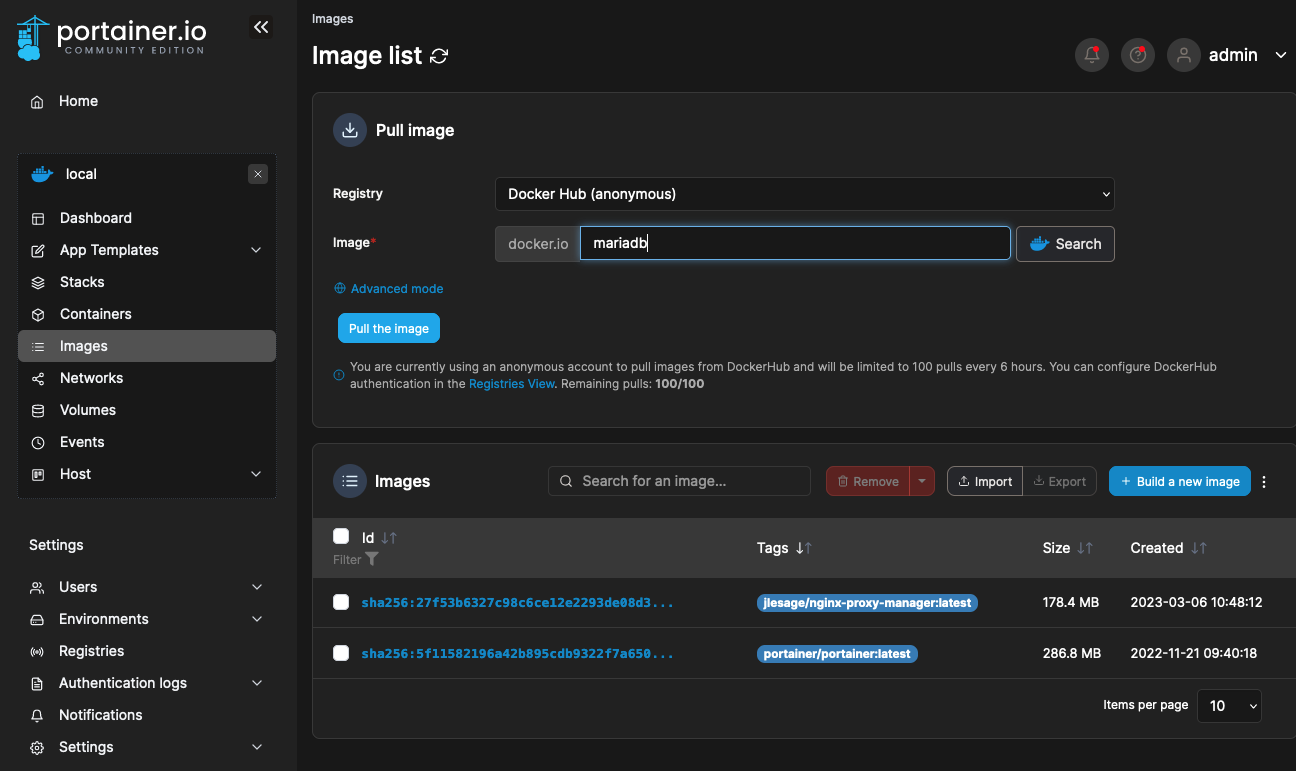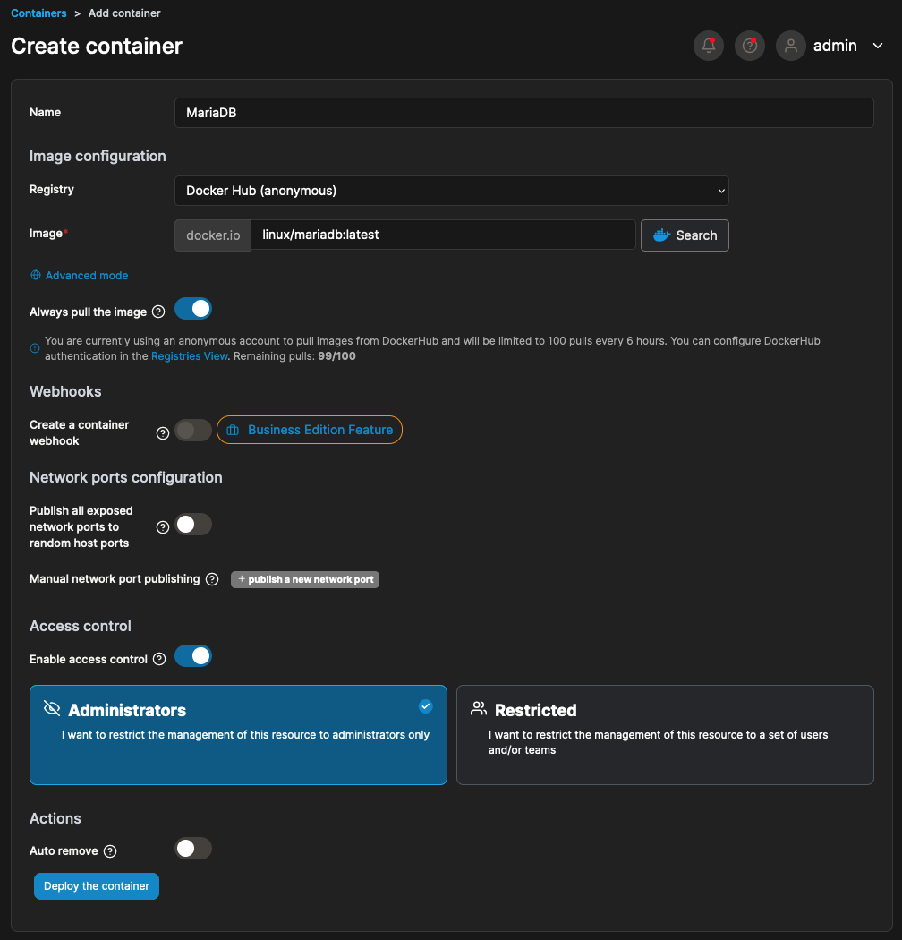 image 입력란에는 linux/mariadb:latest 를 입력합니다.